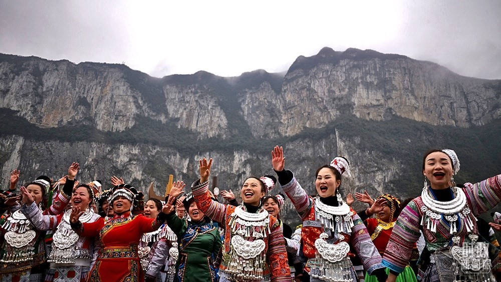 △2021年2月,習(xí)近平總書記來(lái)到貴州化屋村考察,當(dāng)?shù)卮迕裼脷g快的苗家歌舞迎接總書記。(總臺(tái)央視記者王哈男拍攝)