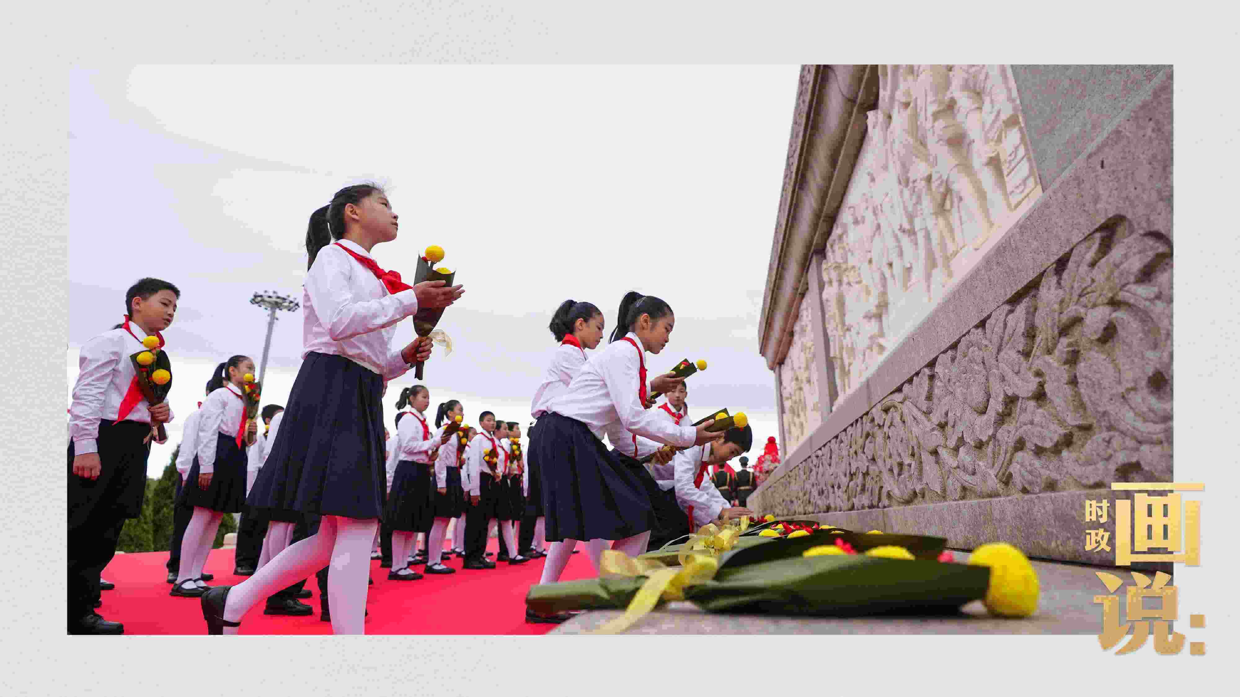 △手持鮮花的少年兒童面向人民英雄紀(jì)念碑高唱《我們是共產(chǎn)主義接班人》。