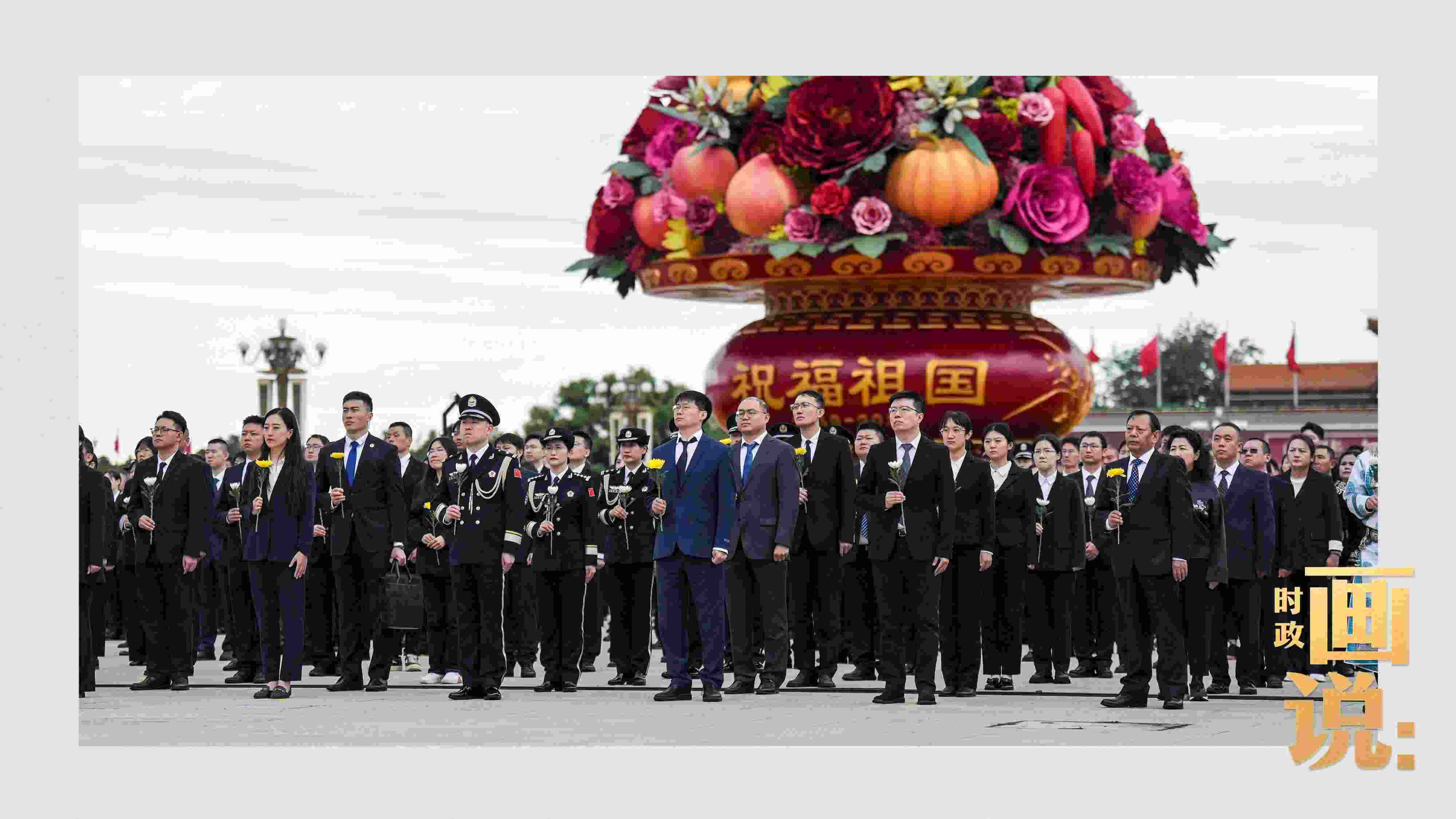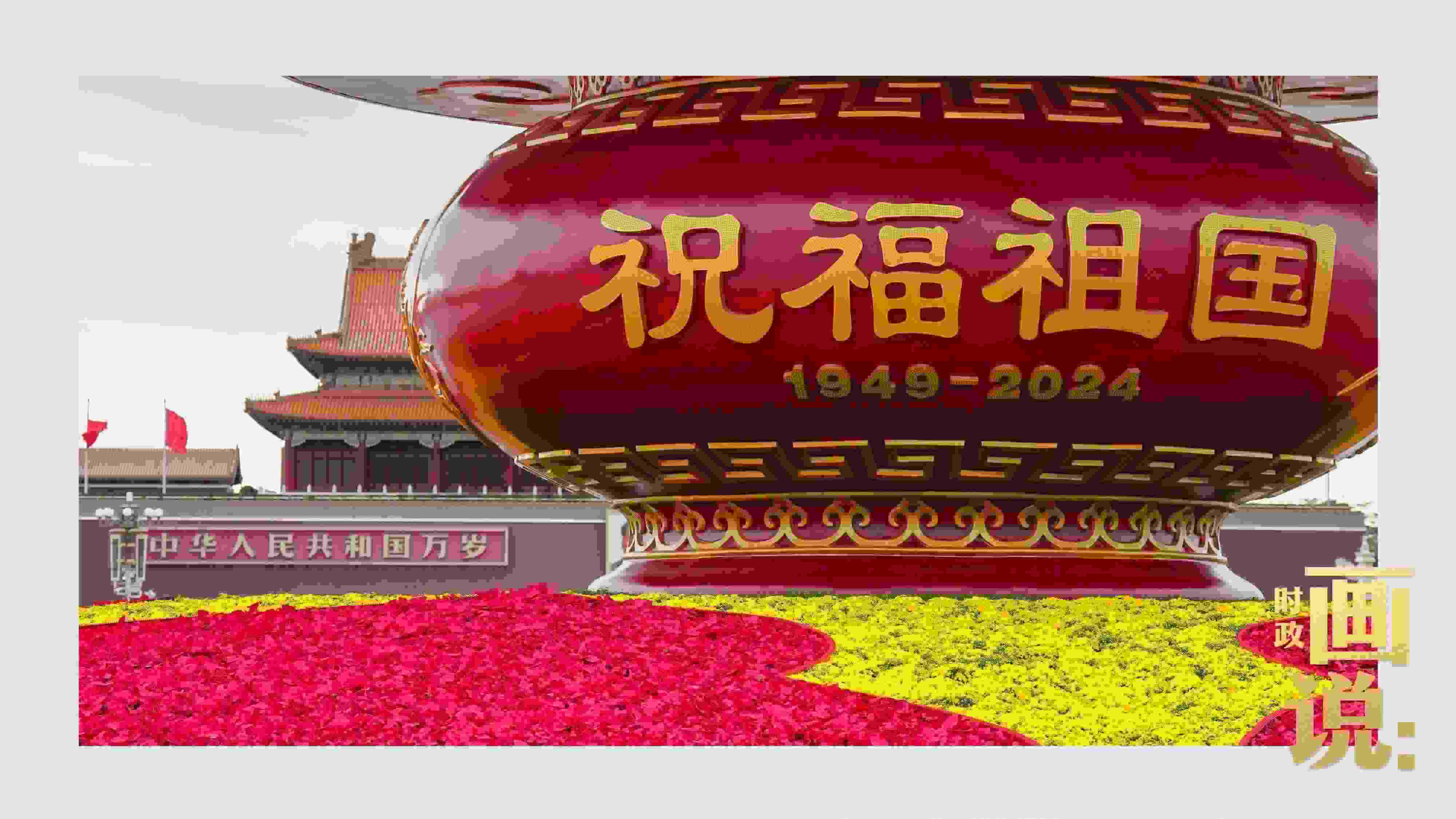 △天安門(mén)廣場(chǎng)中央,“祝福祖國(guó)”巨型花籃表達(dá)著對(duì)國(guó)家繁榮富強(qiáng)的美好祝福。