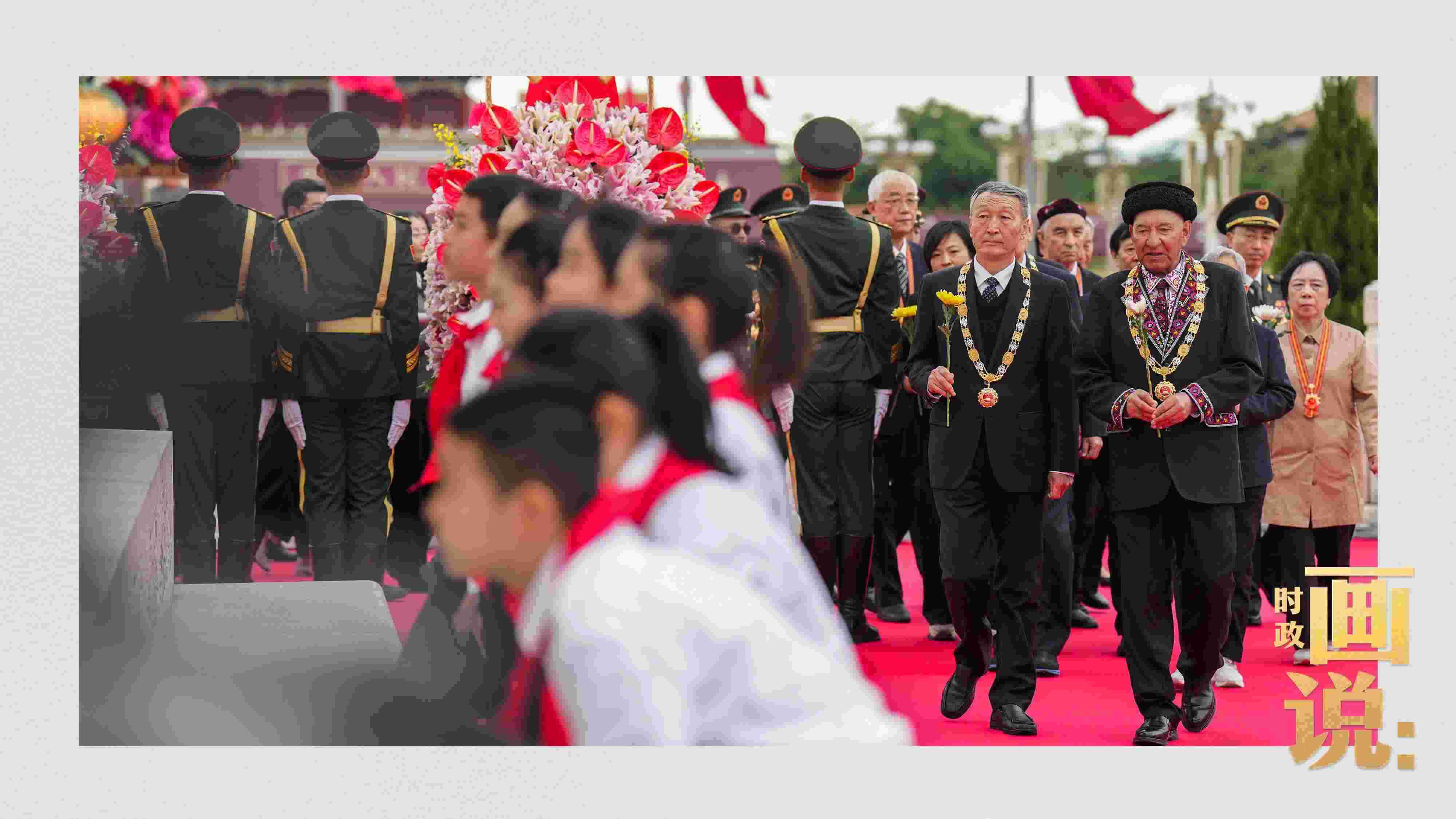 △少年兒童和各界代表依次走到紀(jì)念碑前,獻(xiàn)上手中鮮花并瞻仰紀(jì)念碑。