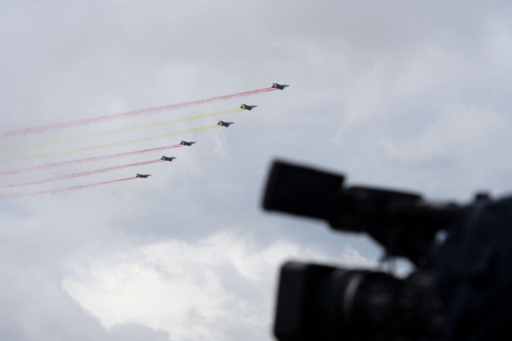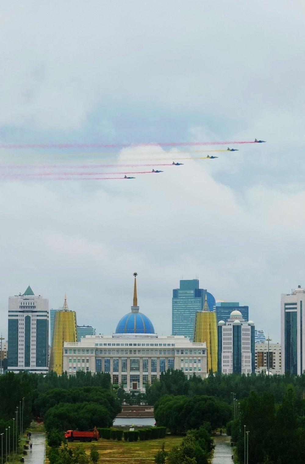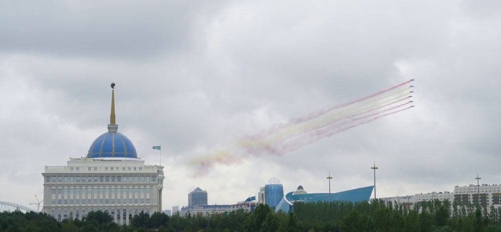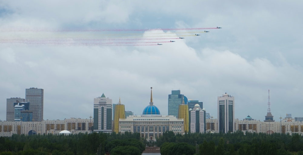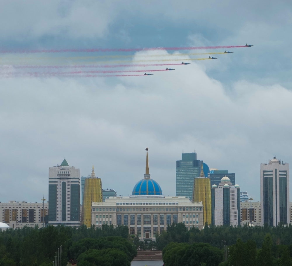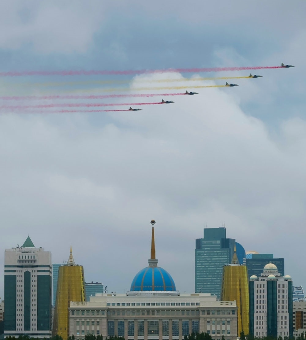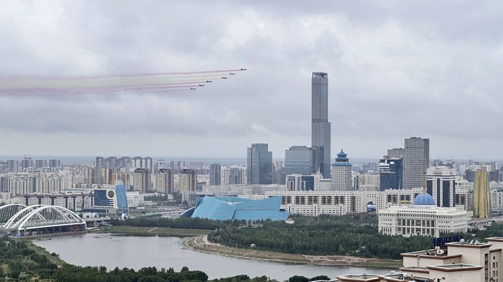 習(xí)近平主席抵達(dá)時(shí),哈方多架戰(zhàn)機(jī)在總統(tǒng)府上空拉出中國(guó)國(guó)旗色彩煙歡迎中國(guó)貴賓。