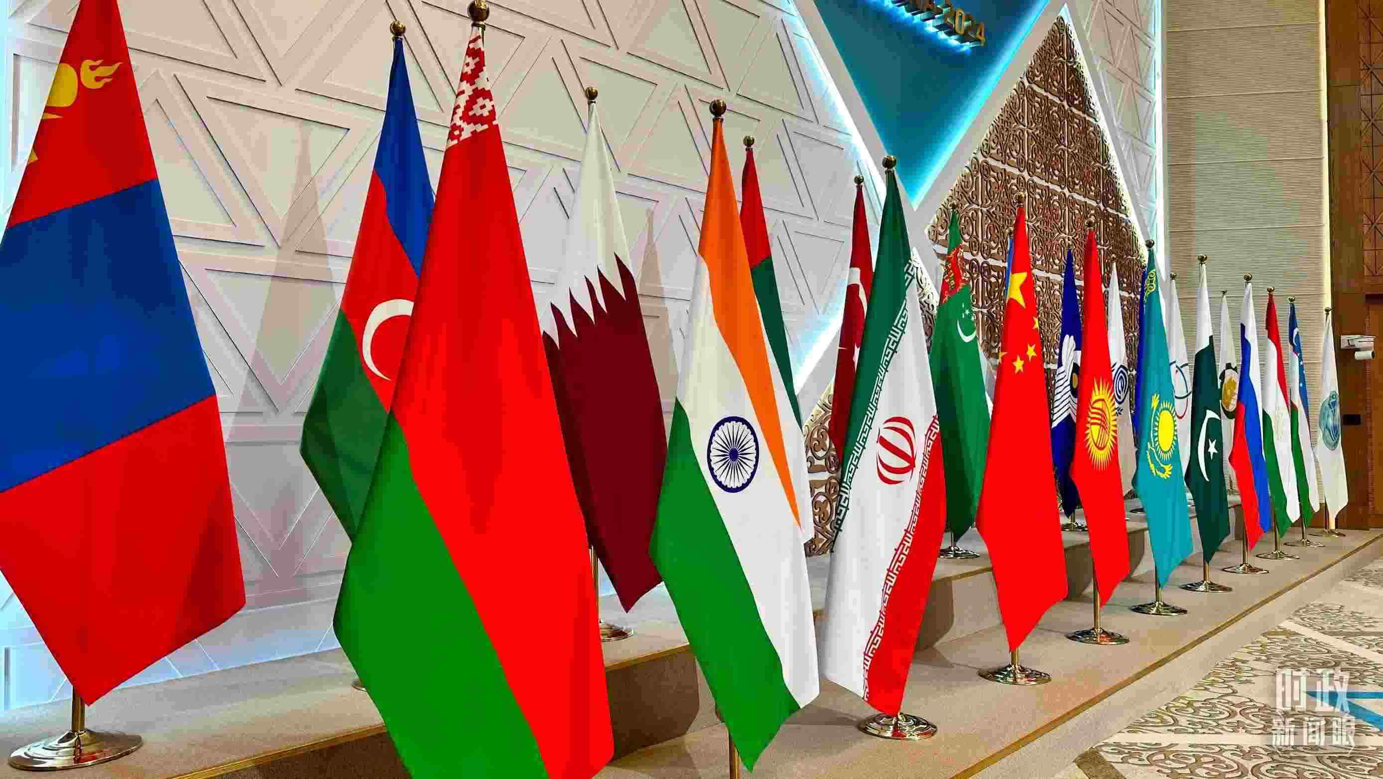 △阿斯塔納峰會現(xiàn)場擺放的旗幟。(總臺央廣記者馬喆拍攝)
