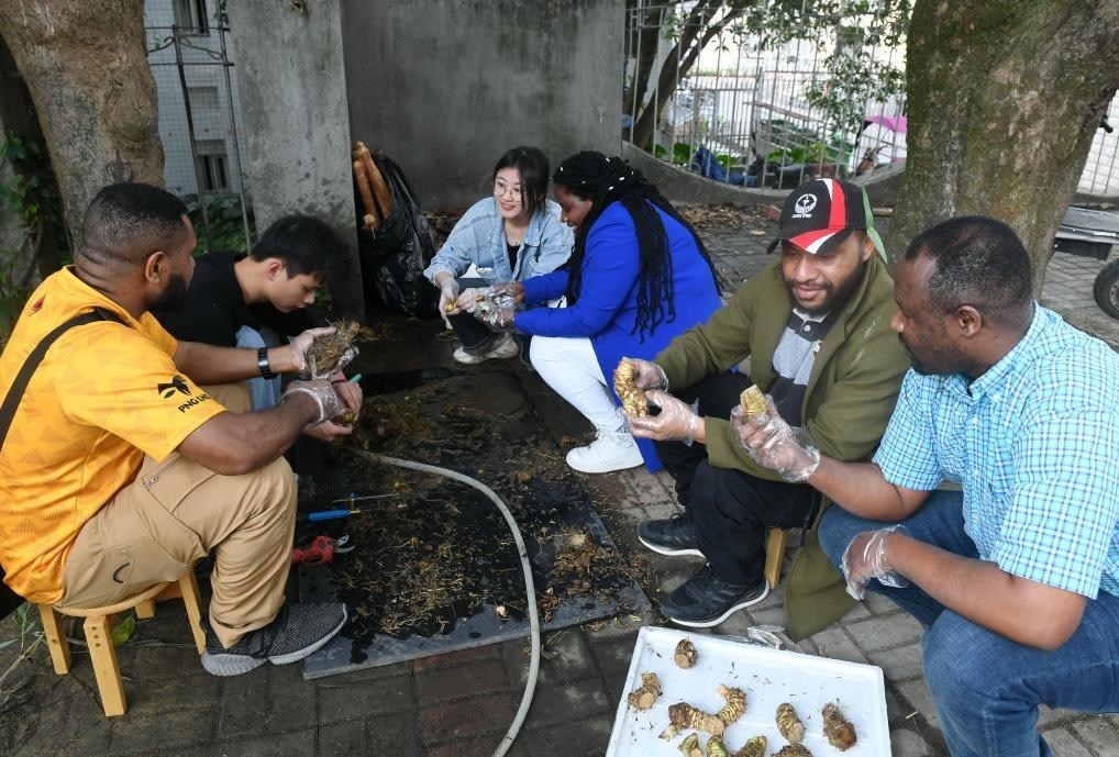 3月28日,在位于福州的福建農林大學,來自盧旺達和巴布亞新幾內亞的學生與菌草專業(yè)學生交流。新華社記者 林善傳 攝