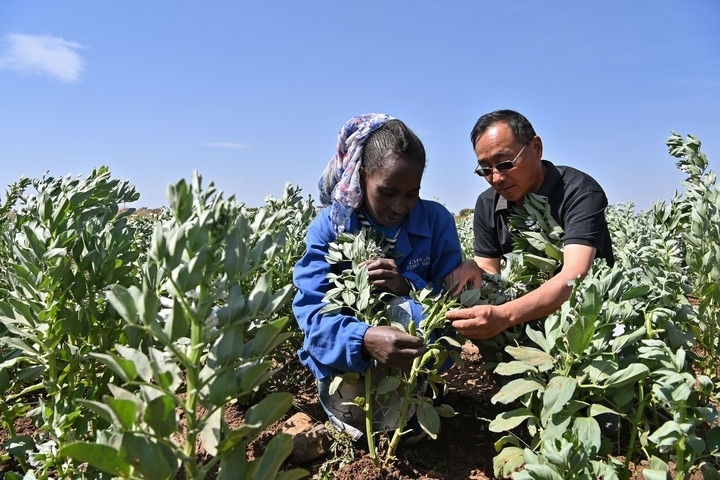 2023年9月27日,在位于厄立特里亞阿斯馬拉的農(nóng)業(yè)技術(shù)援助項(xiàng)目示范地,中國(guó)援厄第三期高級(jí)農(nóng)業(yè)專(zhuān)家組豆類(lèi)作物專(zhuān)家劉運(yùn)民(右)指導(dǎo)當(dāng)?shù)剞r(nóng)戶(hù)進(jìn)行蠶豆作物的田間管理。新華社記者 韓旭 攝