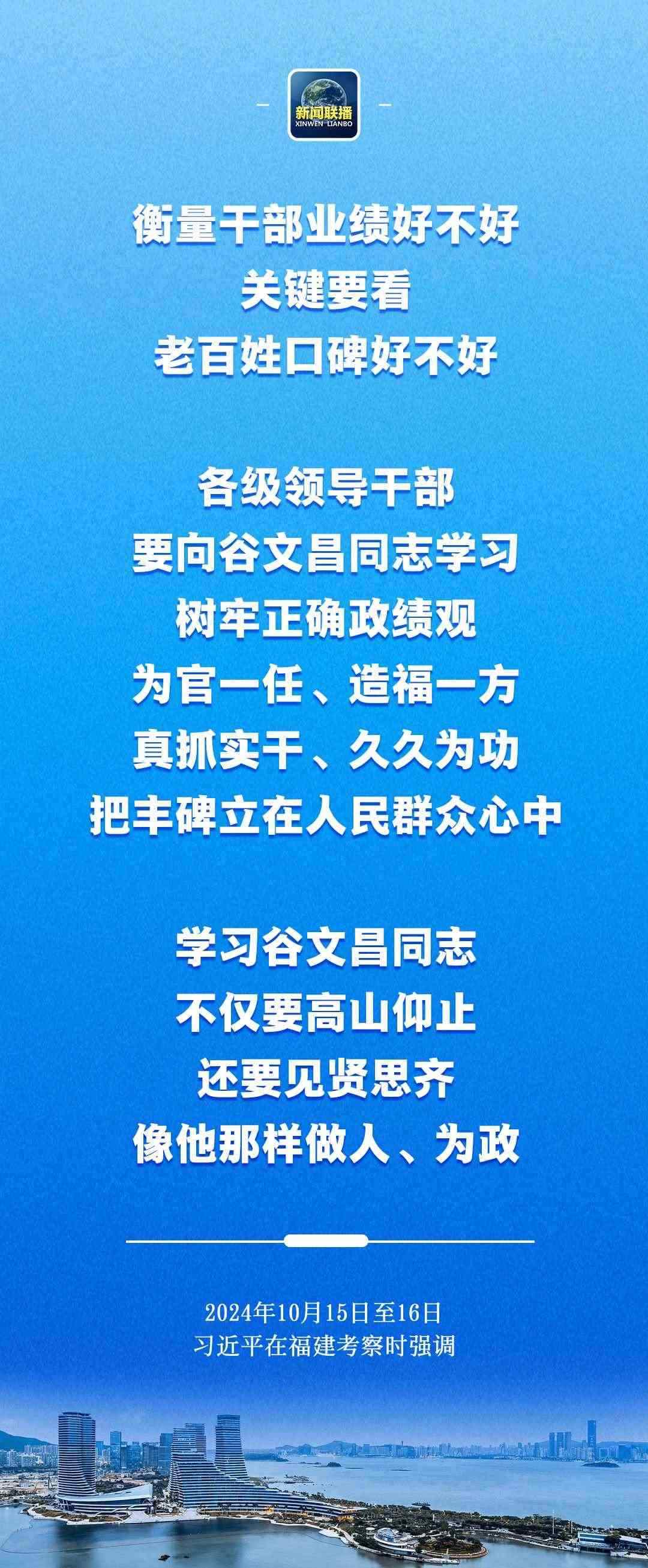 習(xí)近平在谷文昌紀(jì)念館考察時(shí)指出,衡量干部業(yè)績(jī)好不好,關(guān)鍵要看老百姓口碑好不好。各級(jí)領(lǐng)導(dǎo)干部要向谷文昌同志學(xué)習(xí),樹(shù)牢正確政績(jī)觀,為官一任、造福一方,真抓實(shí)干、久久為功,把豐碑立在人民群眾心中。學(xué)習(xí)谷文昌同志,不僅要高山仰止,還要見(jiàn)賢思齊,像他那樣做人、為政。