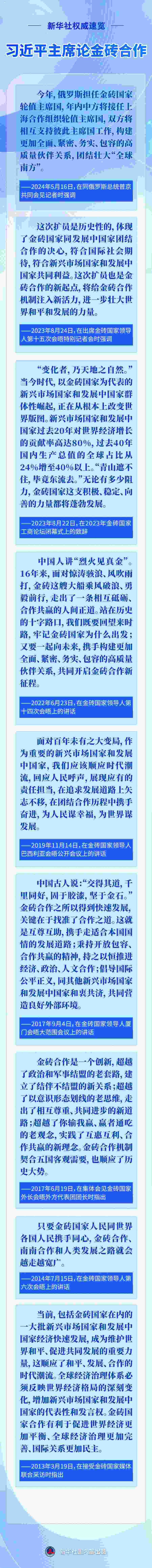 應(yīng)俄羅斯聯(lián)邦總統(tǒng)普京邀請(qǐng),國(guó)家主席習(xí)近平將于10月22日至24日赴俄羅斯喀山出席金磚國(guó)家領(lǐng)導(dǎo)人第十六次會(huì)晤。今年是“大金磚合作”開(kāi)局之年,此次會(huì)晤是金磚擴(kuò)員后首次舉行,國(guó)際社會(huì)廣泛關(guān)注。近年來(lái),習(xí)近平主席圍繞金磚合作作出一系列重要論述,一起重溫——