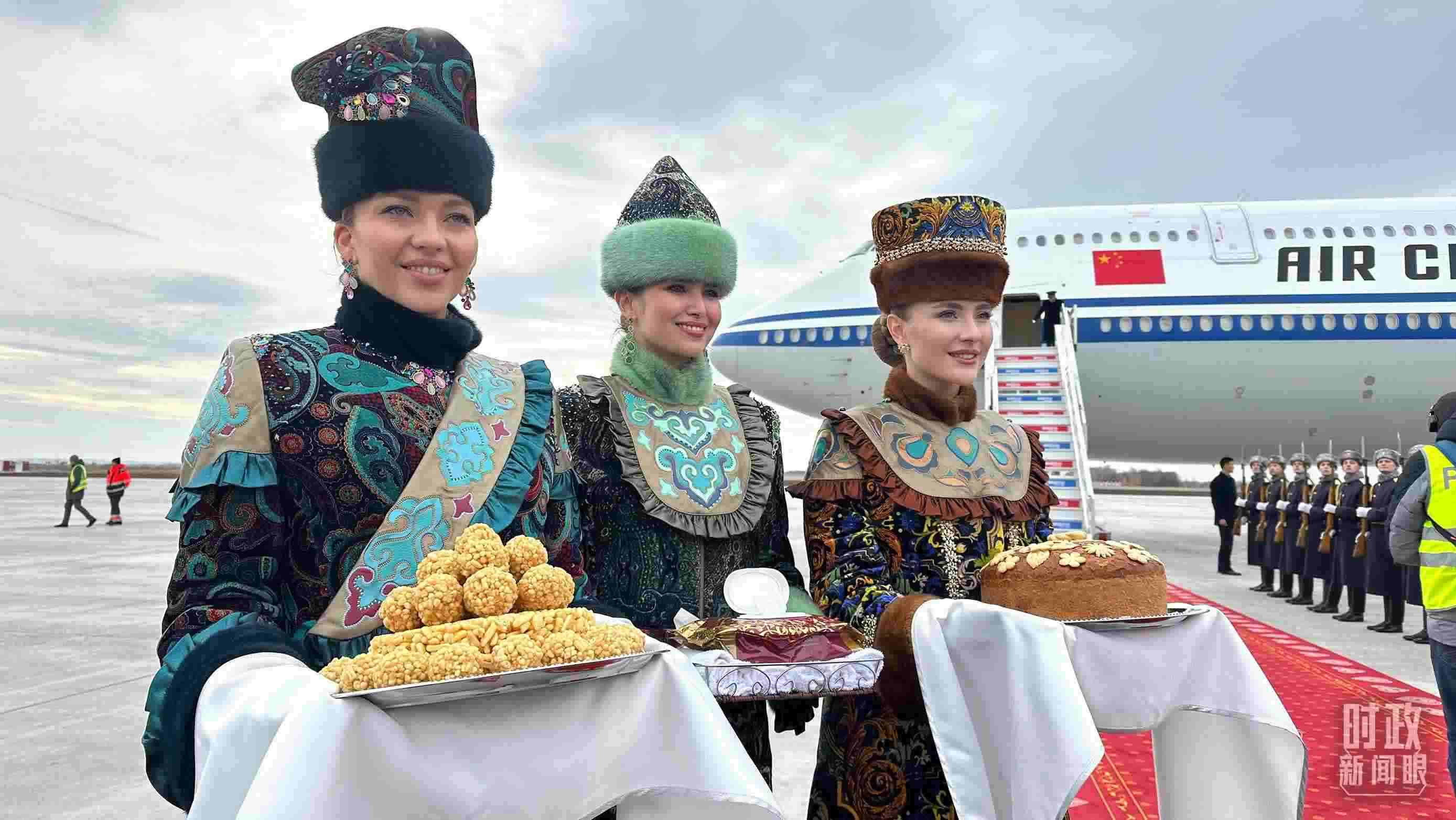 △ 習主席專機抵達喀山國際機場時,禮兵在紅毯兩側列隊致敬,身著民族服裝的俄羅斯女青年用傳統禮節(jié)表示歡迎。(總臺央視記者盧心雨拍攝)