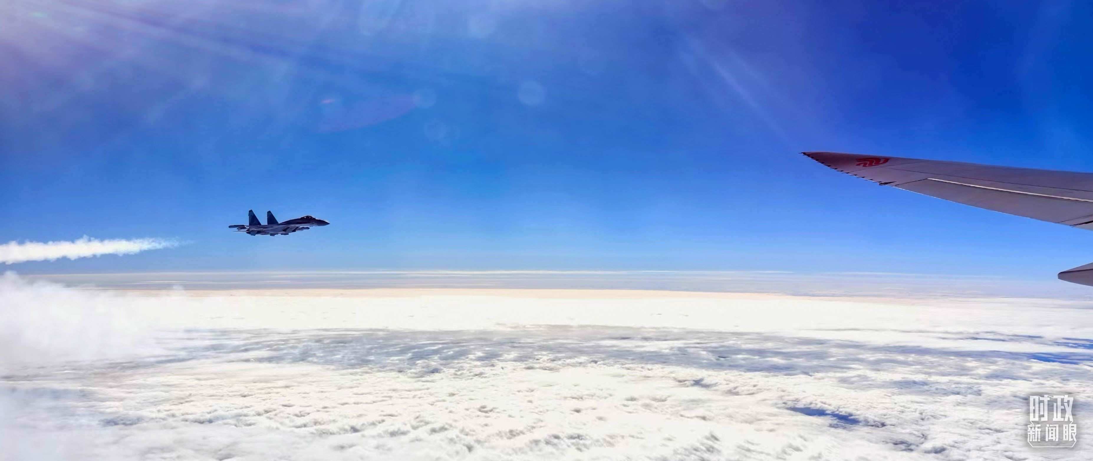 △ 習主席乘坐的專機進入俄羅斯領空時,俄空軍戰(zhàn)機升空護航。(總臺央視記者李錚拍攝)