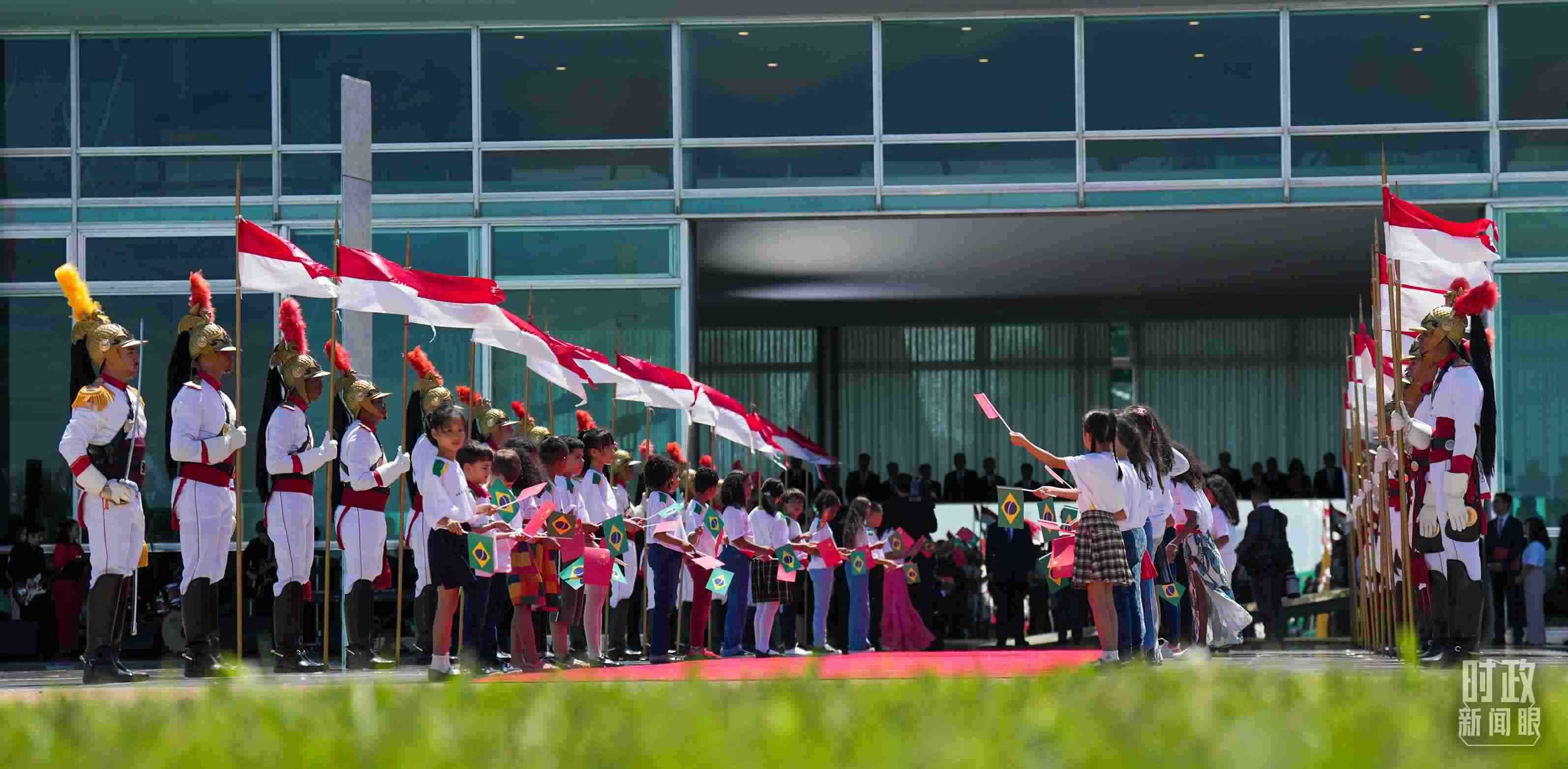 儀式現(xiàn)場(chǎng),中國(guó)和巴西兩國(guó)兒童揮舞國(guó)旗熱烈歡迎習(xí)主席。