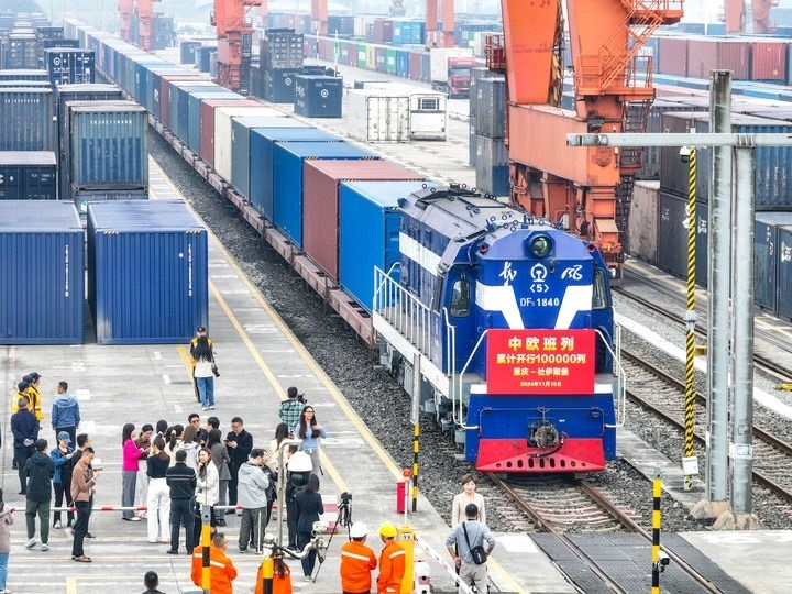 11月15日上午10時20分,重慶團結村中心站。隨著X8083次中歐班列(重慶—杜伊斯堡)從站臺緩緩駛出,中歐班列累計開行突破10萬列。