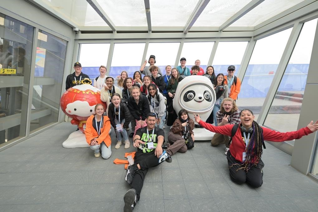 2024年3月21日,美國華盛頓州中學(xué)生代表團的成員在首鋼滑雪大跳臺上與冰墩墩、雪容融合影。新華社記者 李鑫 攝