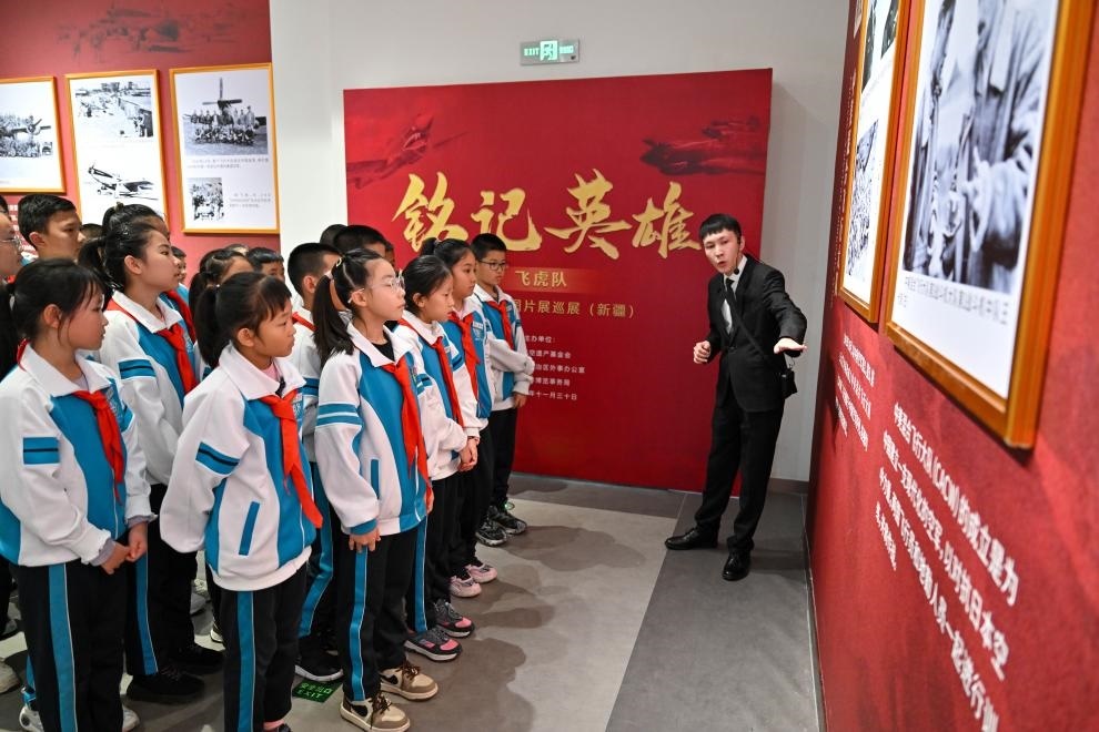 2024年11月30日,烏魯木齊八一中學(xué)的學(xué)生在觀看“銘記英雄——飛虎隊主題歷史圖片展巡展(新疆)”。新華社記者 丁磊 攝