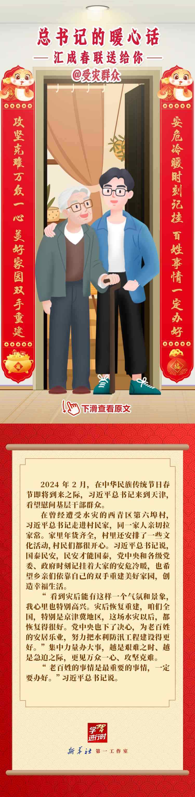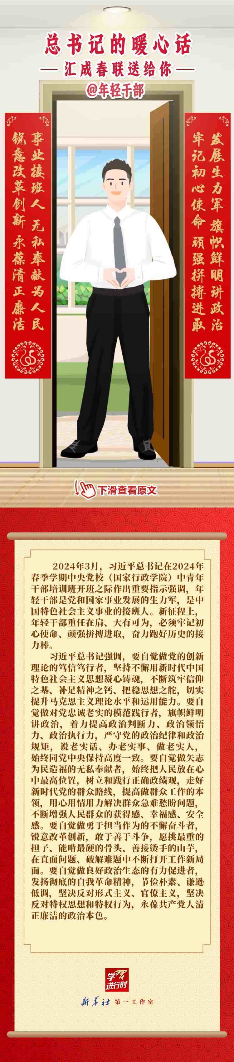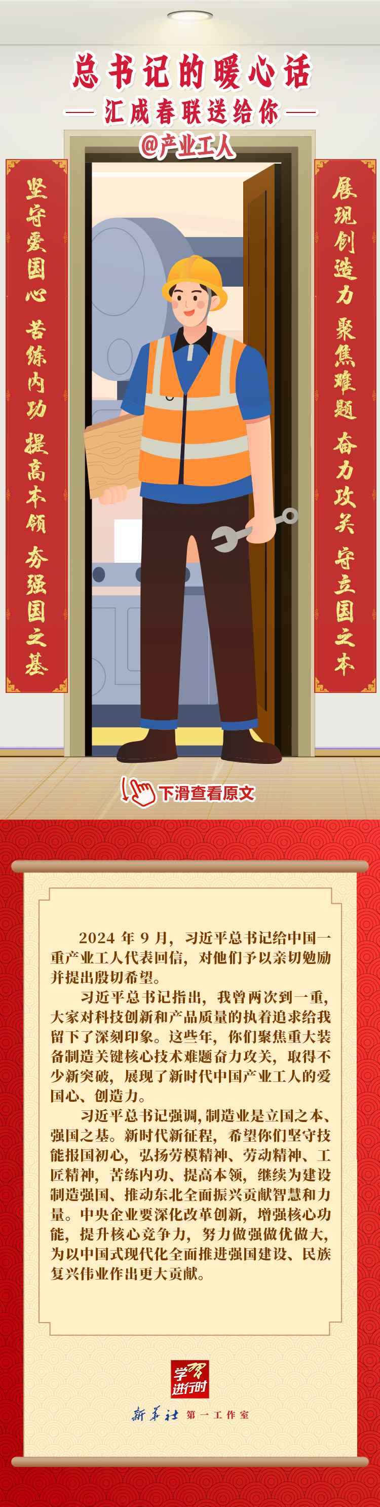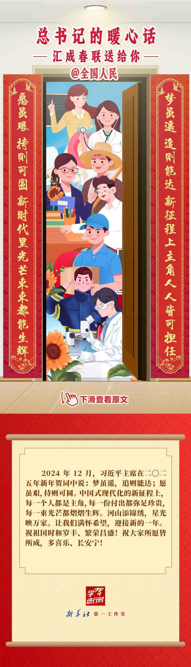 【學(xué)習(xí)進(jìn)行時(shí)】過春節(jié),貼春聯(lián),寄托人們對(duì)新年的美好愿望。過去一年,習(xí)近平總書記在不同場合點(diǎn)贊各行各業(yè)奮斗者,說了許多暖心話。新春之際,我們匯編成聯(lián),向新征程上的每一位“主角”致敬,送上新春的祝福。
