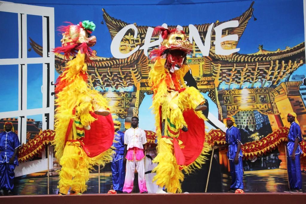 △當?shù)貢r間1月25日,在貝寧科托努的貝寧中國文化中心,演員在表演舞獅慶祝春節(jié)。