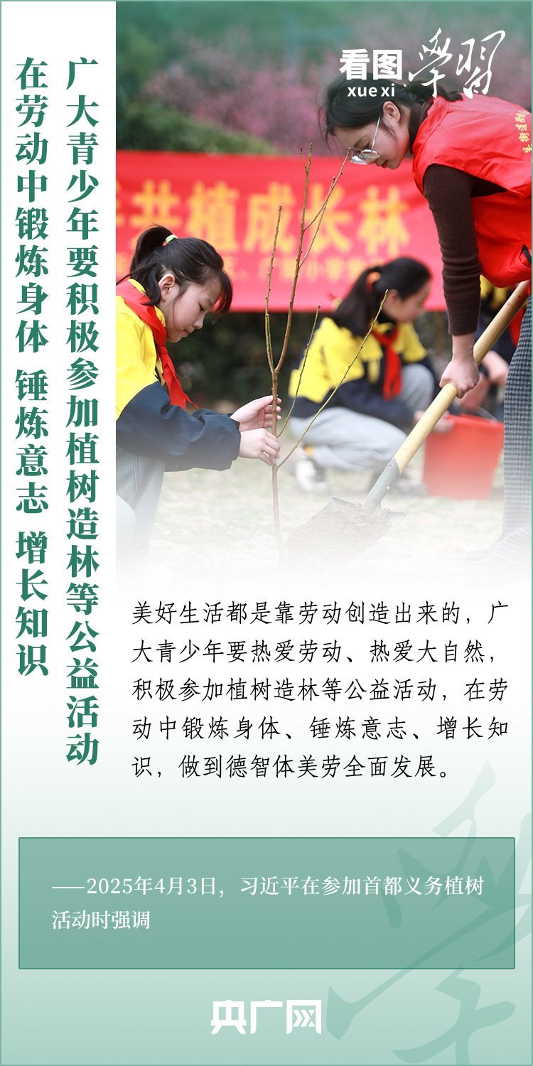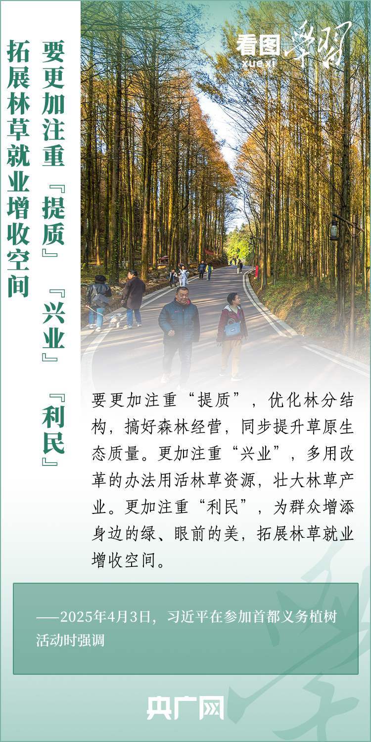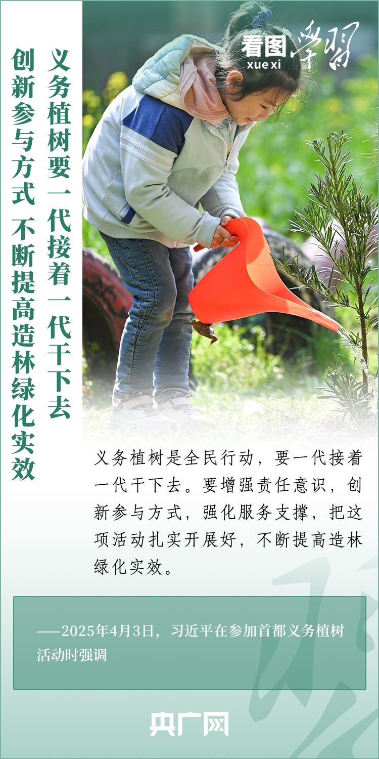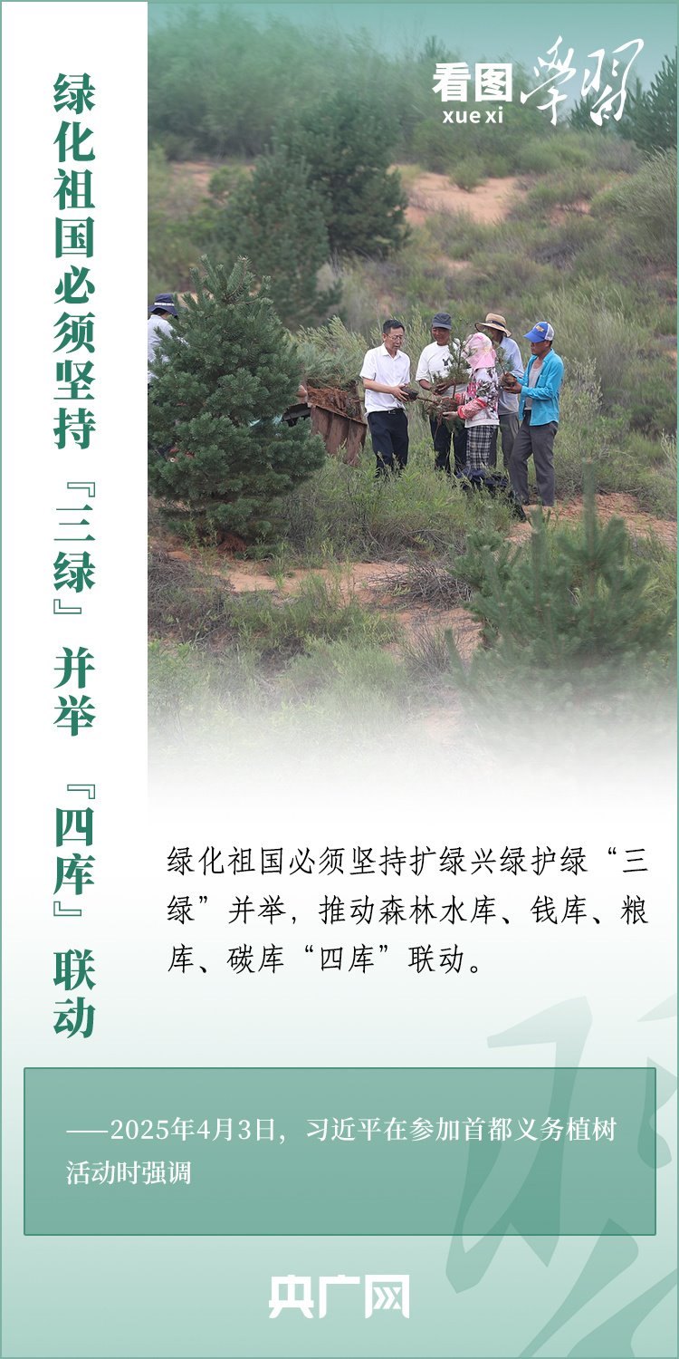 植樹造林是生態(tài)文明建設(shè)重要一環(huán)。4月3日,習(xí)近平總書記參加首都義務(wù)植樹活動。在植樹現(xiàn)場,總書記高度肯定國土綠化工作取得來之不易的成績,強(qiáng)調(diào)綠化祖國必須堅(jiān)持“三綠”并舉、“四庫”聯(lián)動,要更加注重“提質(zhì)”“興業(yè)”“利民”,“匯聚共建美麗中國的磅礴力量,讓祖國大地更加綠意盎然、生機(jī)勃發(fā)”。一起來學(xué)習(xí)!