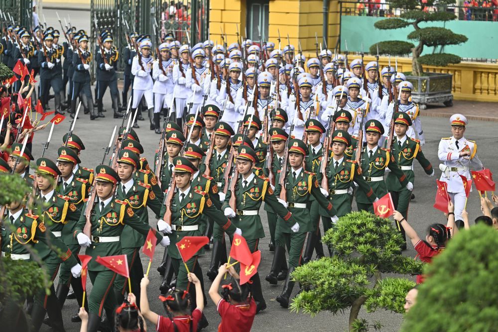 當?shù)貢r間4月14日,中共中央總書記、國家主席習近平在河內(nèi)出席越共中央總書記蘇林舉行的歡迎儀式。