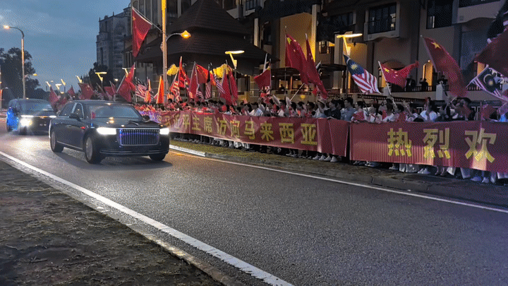 習近平乘車從機場赴下榻飯店途中,當地中資企業(yè)人員、留學生在道路兩旁揮舞中馬兩國國旗,高舉“熱烈歡迎習近平主席訪問馬來西亞”、“中馬友誼萬歲”等紅色橫幅,華僑華人表演喜慶熱烈的舞獅,歡迎習近平到訪。