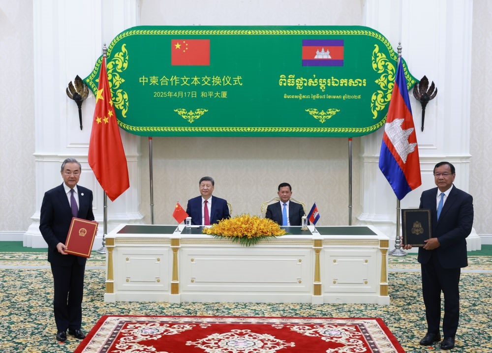 產(chǎn)供鏈合作、人工智能合作、發(fā)展援助合作、海關(guān)檢驗檢疫合作……雙方代表一次次走上大廳中央的紅色方毯,交換合作文本。深化更高水平政治互信、拓展更高質(zhì)量互利合作、筑牢更高層次安全保障、開展更高頻率人文交流、強化更高標(biāo)準(zhǔn)戰(zhàn)略協(xié)作,從五大領(lǐng)域發(fā)力,中柬關(guān)系向更高水平邁進(jìn)。