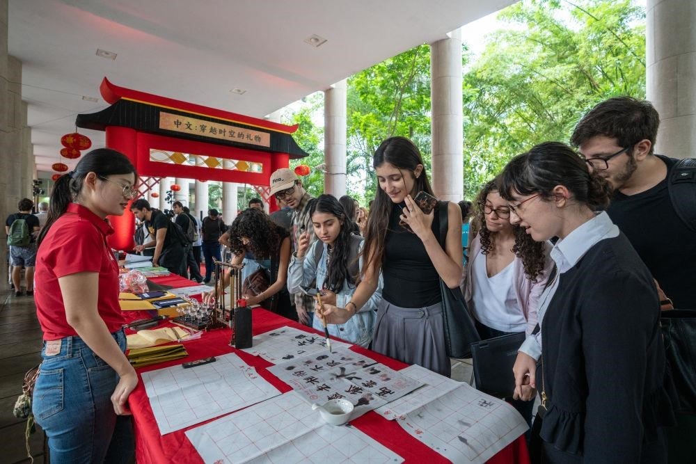 △2025年4月,在巴西里約熱內(nèi)盧天主教大學(xué)舉辦的“國際中文日”慶?;顒由?,學(xué)生們體驗(yàn)中文書法。