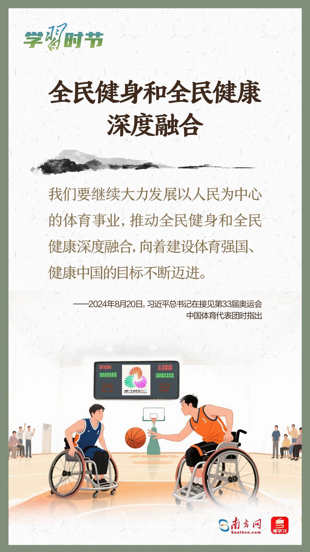 今年5月17日拉開帷幕的第十一屆全民營養(yǎng)周,以“吃動平衡 健康體重 全民行動”為主題,向全社會傳遞運動和飲食在健康生活中同等重要的理念。而今年11月至12月由粵港澳三地共同承辦的十五運會和殘?zhí)貖W會,充分發(fā)揮賽事的“全民性”,將群眾體育發(fā)展推向新高度。