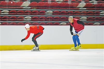 市民在呼和浩特體育中心綜合體育館冰場內(nèi)滑冰。 記者 孟和朝魯 攝
