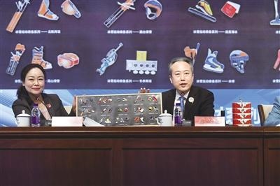 12月30日,北京冬奧組委召開(kāi)市場(chǎng)開(kāi)發(fā)、物流和注冊(cè)工作新聞發(fā)布會(huì)。圖為北京冬奧組委市場(chǎng)開(kāi)發(fā)部部長(zhǎng)樸學(xué)東(右)現(xiàn)場(chǎng)展示北京冬奧會(huì)特許商品。 新京報(bào)記者 陶冉 攝