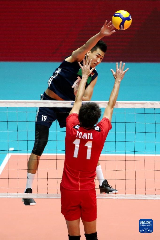 8月14日,中國(guó)隊(duì)球員張景胤(左一)在比賽中扣球。新華社記者 王騰 攝
