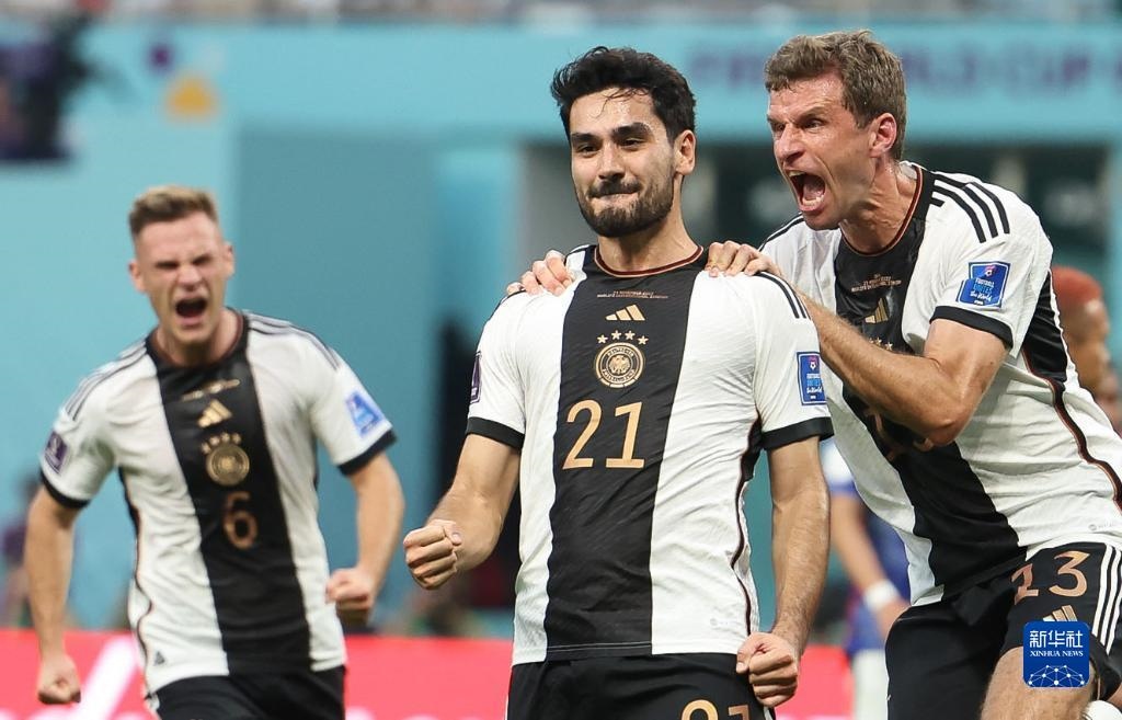 11月23日,德國隊(duì)球員伊爾凱·京多安(中)進(jìn)球后慶祝。新華社記者 潘昱龍 攝