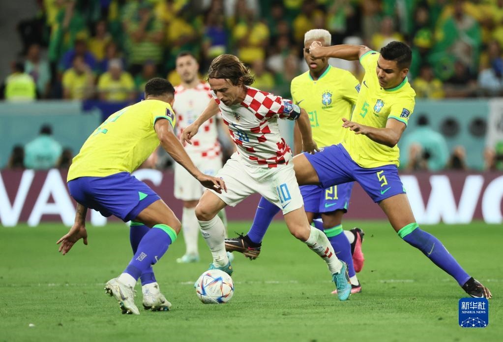 12月9日,克羅地亞隊(duì)球員莫德里奇(左二)與巴西隊(duì)球員卡塞米羅(右一)在比賽中拼搶。新華社記者 蘭紅光 攝