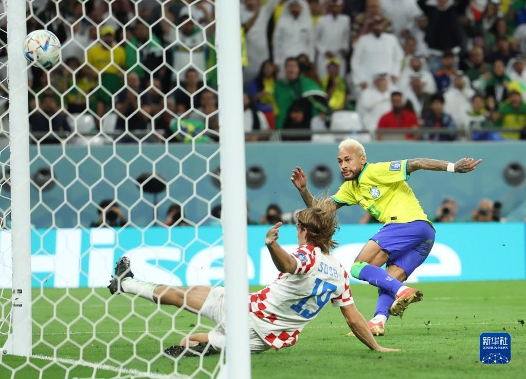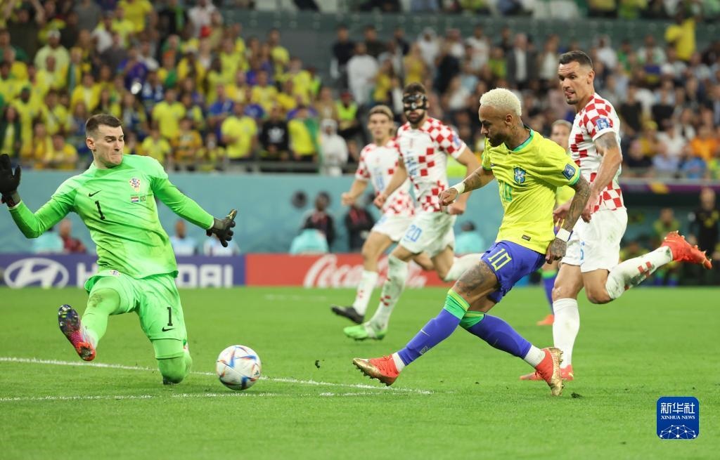 12月9日,巴西隊(duì)球員內(nèi)馬爾(右二)在比賽中突破克羅地亞隊(duì)守門(mén)員利瓦科維奇(右三)的防守后射門(mén)得分。新華社記者 蘭紅光 攝