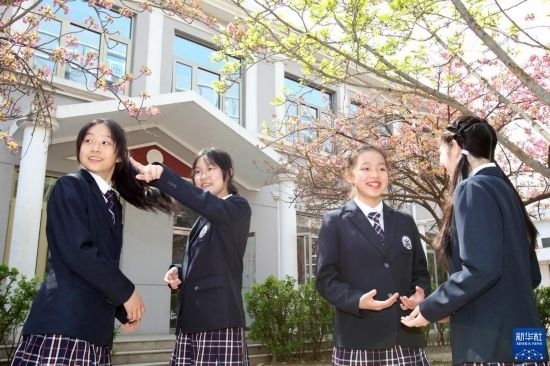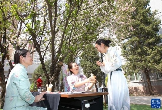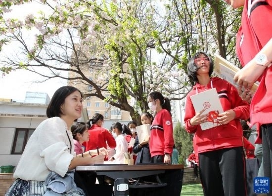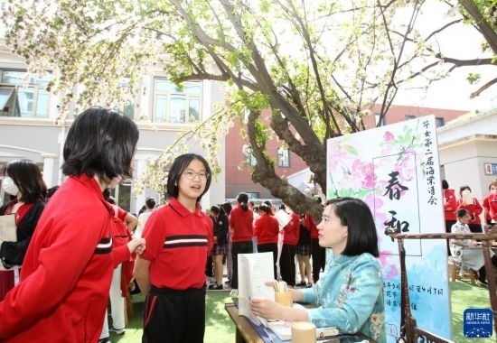 當(dāng)日,北師大實(shí)驗(yàn)華夏女子中學(xué)舉辦以“春和”為主題的第二屆“海棠詩會(huì)”。師生們選取有關(guān)“春天”“和煦”“生機(jī)”“美好”的詩歌,在校園的海棠樹下賞析吟誦,共享詩歌之美,傳承中華優(yōu)秀傳統(tǒng)文化。
