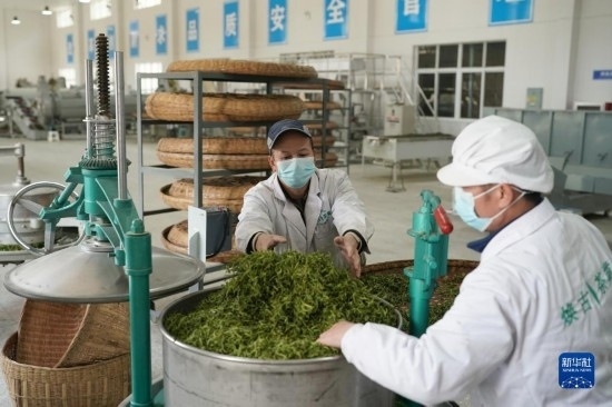 4月6日,工作人員在紫陽縣煥古鎮(zhèn)一家茶企車間內工作。
