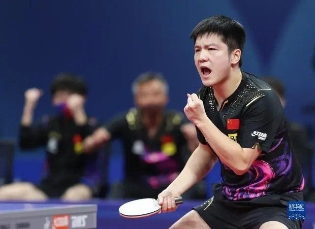 2022年10月9日,中國隊選手樊振東在比賽中慶祝得分,他以3:0戰(zhàn)勝德國隊選手貝內(nèi)迪克特·杜達。當(dāng)日,在成都世乒賽男團決賽中,中國乒乓球男隊3:0戰(zhàn)勝德國隊。 新華社記者江宏景攝