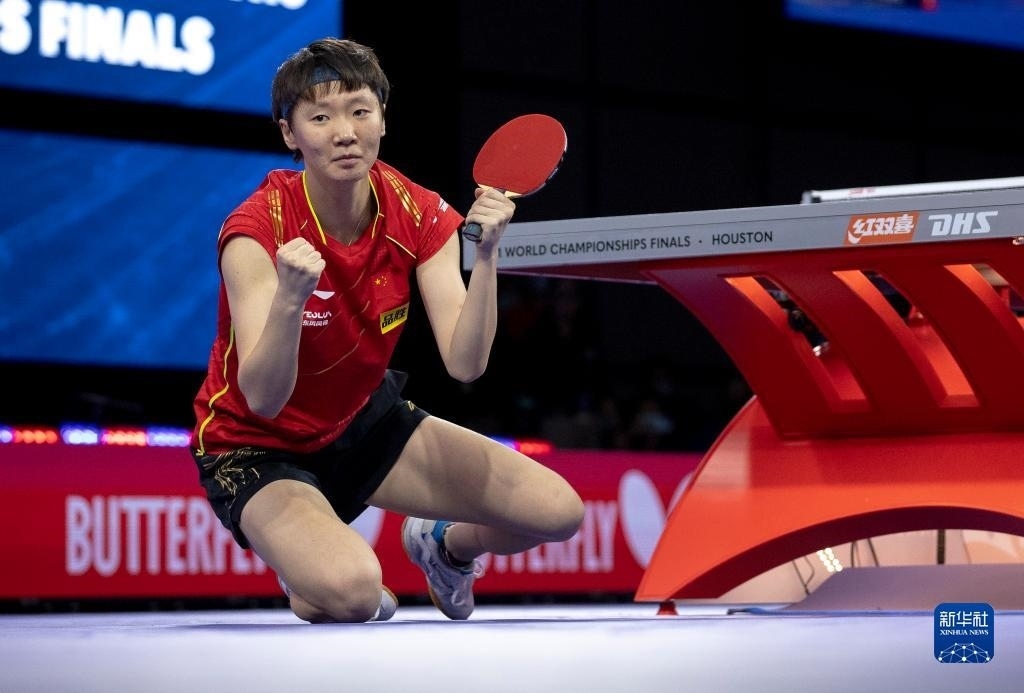 2021年11月29日,王曼昱慶祝奪冠。當(dāng)日,在美國休斯敦進行的2021世界乒乓球錦標賽女子單打決賽中,中國選手王曼昱以4:2戰(zhàn)勝隊友孫穎莎,奪得冠軍。 新華社瓦格納攝