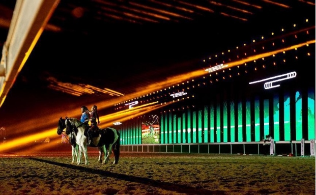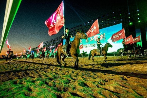 開幕式文體表演由《馬術(shù)方陣一馬當(dāng)先》、歌伴舞《我的城我的馬》、《名馬展示策馬揚鞭》、《單馬技巧雙翼神馬》、《馬障礙秀躍馬揚鞭》、《馬術(shù)秀人馬合一》、歌伴舞《騎跡包頭》、《無人機(jī)秀馬上精彩》八塊內(nèi)容組成。當(dāng)晚的賽汗塔拉馬術(shù)賽場流光溢彩、氣氛熱烈,場內(nèi)座無虛席、歡聲雷動。20時30分許,主騎手手持國旗,副騎手手持馬城旗幟,運動員方陣、民族方陣、女騎方陣、馬主方陣入場,騎手們精神飽滿、英姿颯爽,不時揮手致意,現(xiàn)場觀眾用熱烈的掌聲和歡呼聲,歡迎他們的到來。達(dá)茂旗9歲賽馬冠軍阿茹樂手持彩旗引出世界名馬亮相,40對人馬合一的“千古馬頌”表演震撼全場,1000架無人機(jī)躍然天空,點亮“騎跡包頭 馬上精彩”的字樣……藍(lán)天、碧水、凈土的包頭在策馬奔騰的馬術(shù)競技中拉開了“中國馬城”的壯麗畫卷。