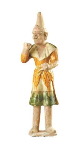 展覽中的“黃綠釉執(zhí)壺胡俑”與廣州博物館收藏的兩件胡俑非常類似。廣州博物館藏的那對胡人俑一個為中國國家博物館移交,另一個為舊藏。這三件來源各異的俑均高約28.5厘米,頭戴氈帽,鼻子高高隆起,呈鷹鉤狀,上唇有八字分開的胡須,胡子尾部上翹,臉部有濃密的絡腮胡;身著圓領窄袖的衣服,腰間束帶,下身著褲,腳套皮靴,雙腿并立站在方形小臺上,一手平放在胸前,一手下垂到腹部前,提著一個帶流的長頸瓶子。有學者指出,他們是走街串巷做買賣的小胡商,手持的執(zhí)壺稱為“胡瓶”,可能是供自己行商途中喝水之用,亦有可能是叫賣的物品。