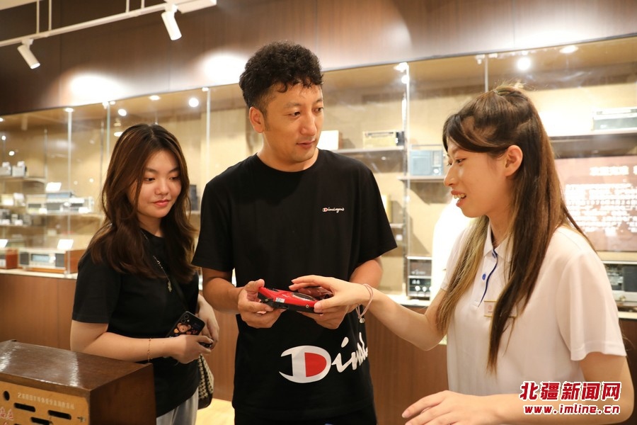 8月17日,游客在內(nèi)蒙古包頭市固陽縣“固陽稒事”美食特產(chǎn)文創(chuàng)街的收音機(jī)收藏館參觀。