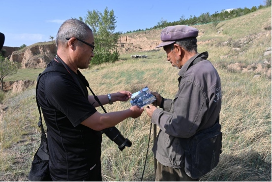 鏡頭見證滄桑,筆尖記錄百姓。這些年,只要疫情緩解,長城人沒有停下腳步,而是一次又一次去看長城、看邊堡、看邊墻下的鄉(xiāng)親們。車靜靜地行駛在空曠、蒼涼的長城腳下,76歲的牧羊人呂三良正在長城邊牧羊。2022年5月24日,呼和浩特市長城科普學(xué)會(huì)會(huì)員追隨牧羊人的腳步,把照片送到呂三良手中,看著老人端詳著照片里的自己,會(huì)員們特別滿足。這,難道就不是一個(gè)攝影人的長城情懷、百姓情懷嗎?(郭雁平 高曉梅)