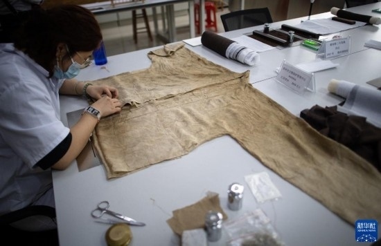 5月20日,在荊州文物保護(hù)中心,修復(fù)人員劉一丹修復(fù)一件南宋紡織品。