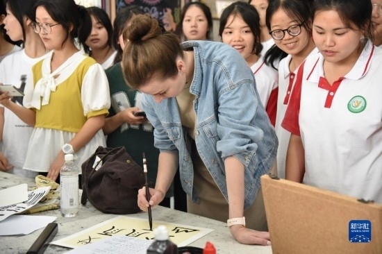 6月5日,參加三都高級(jí)中學(xué)第一屆國(guó)際文化節(jié)的來(lái)華留學(xué)生學(xué)習(xí)書(shū)寫(xiě)水族文字。