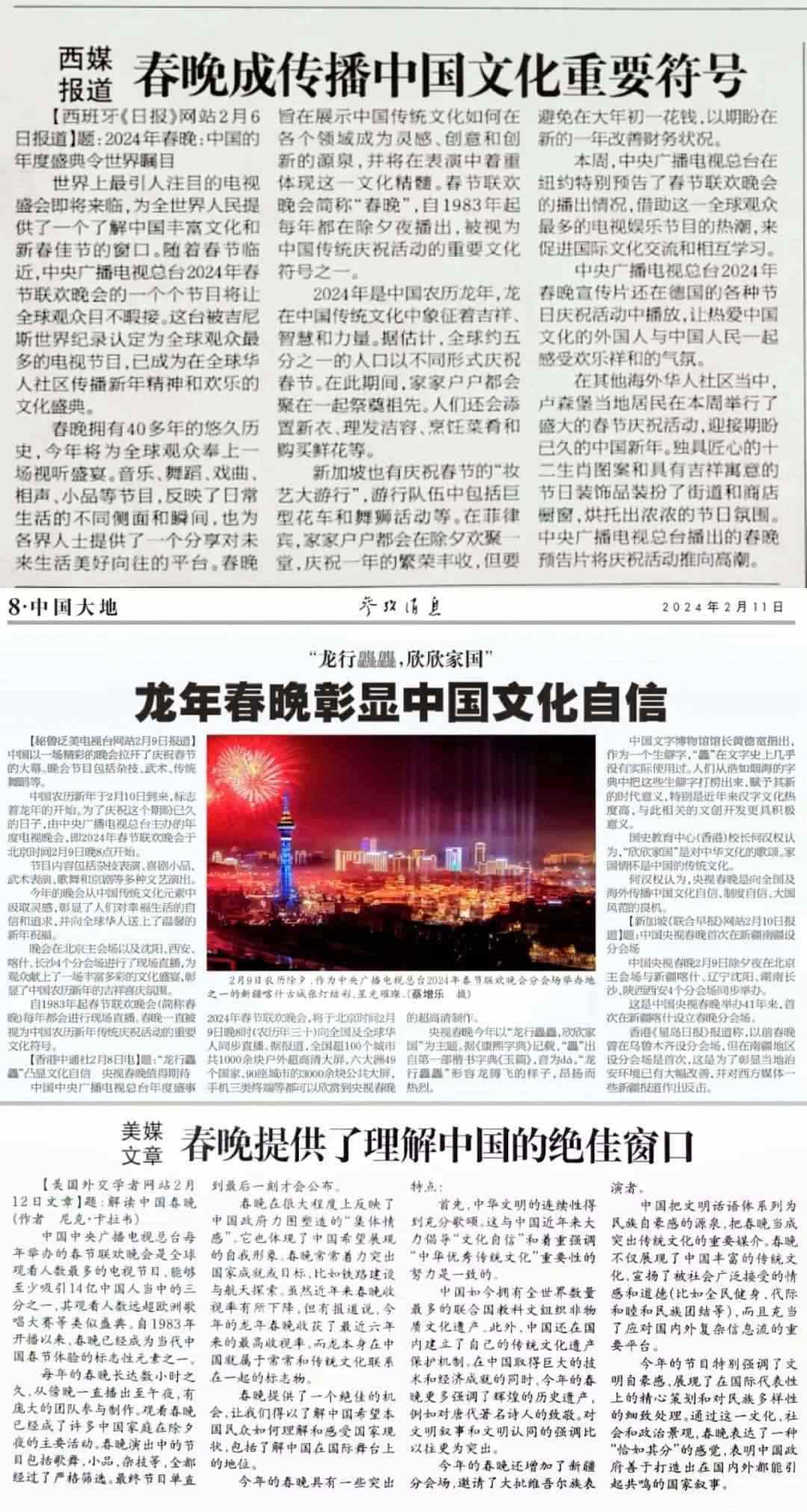 《參考消息》援引西班牙媒體評(píng)論稱,總臺(tái)龍年春晚為全世界人民提供了一個(gè)了解中國(guó)豐富文化的窗口,它展示中國(guó)傳統(tǒng)文化如何在各個(gè)領(lǐng)域成為靈感、創(chuàng)意和創(chuàng)新的源泉,并在音樂(lè)、舞蹈、戲曲等節(jié)目中體現(xiàn)傳統(tǒng)文化的精髓。秘魯、新加坡等媒體報(bào)道稱,龍年春晚彰顯了中國(guó)的文化自信。而美國(guó)《外交學(xué)者》網(wǎng)站署名文章認(rèn)為,龍年春晚為世界提供了理解中國(guó)的絕佳窗口。海外媒體的這些報(bào)道,不約而同地使用了“文化符號(hào)”“標(biāo)志性元素”等詞匯,并從促進(jìn)文化理解、推動(dòng)文化交流等角度對(duì)總臺(tái)春晚的海外影響力進(jìn)行解讀。