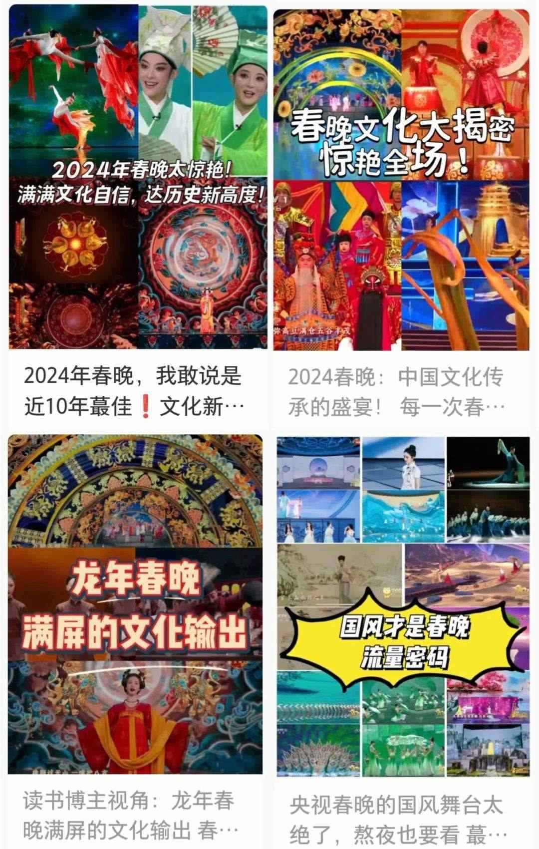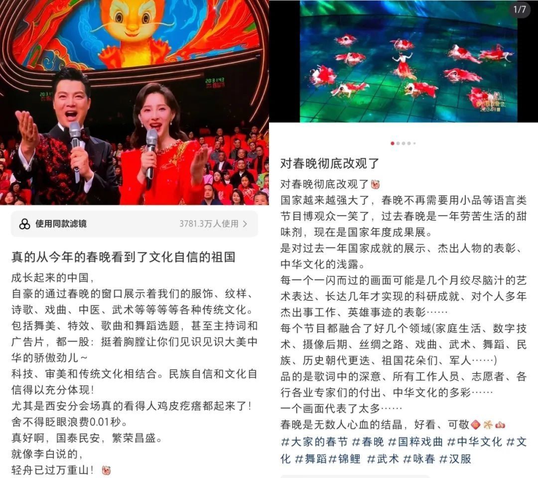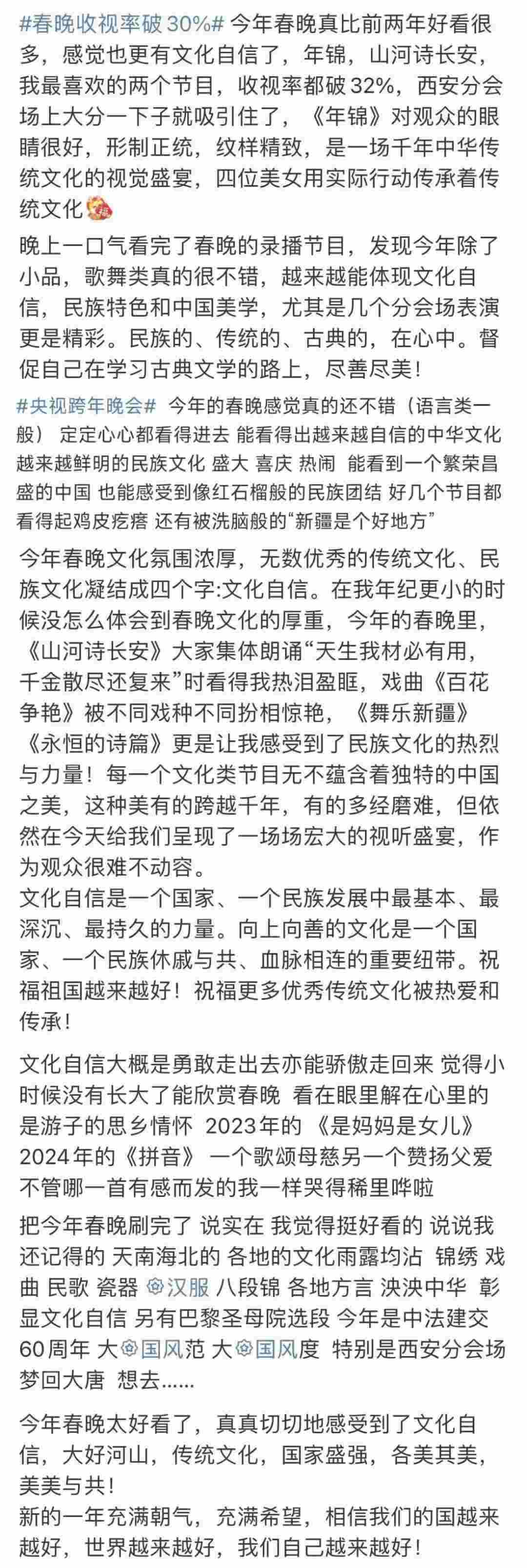 春晚的文化展現(xiàn),在國(guó)人中也引起了熱烈反響?!懊恳粋€(gè)文化類節(jié)目都蘊(yùn)含著獨(dú)特的中國(guó)之美,這種美有的跨越千年,有的多經(jīng)磨難,春晚給我們呈現(xiàn)了一場(chǎng)場(chǎng)宏大的視聽(tīng)盛宴,作為觀眾很難不動(dòng)容”“從今年春晚真真切切地感受到了文化自信,大好河山,傳統(tǒng)文化,國(guó)家強(qiáng)盛,美美與共”“文化傳統(tǒng)特色給各個(gè)節(jié)目都刷了創(chuàng)意的漆,霸氣從節(jié)目中升騰,自信從感嘆中生發(fā),真妙”......