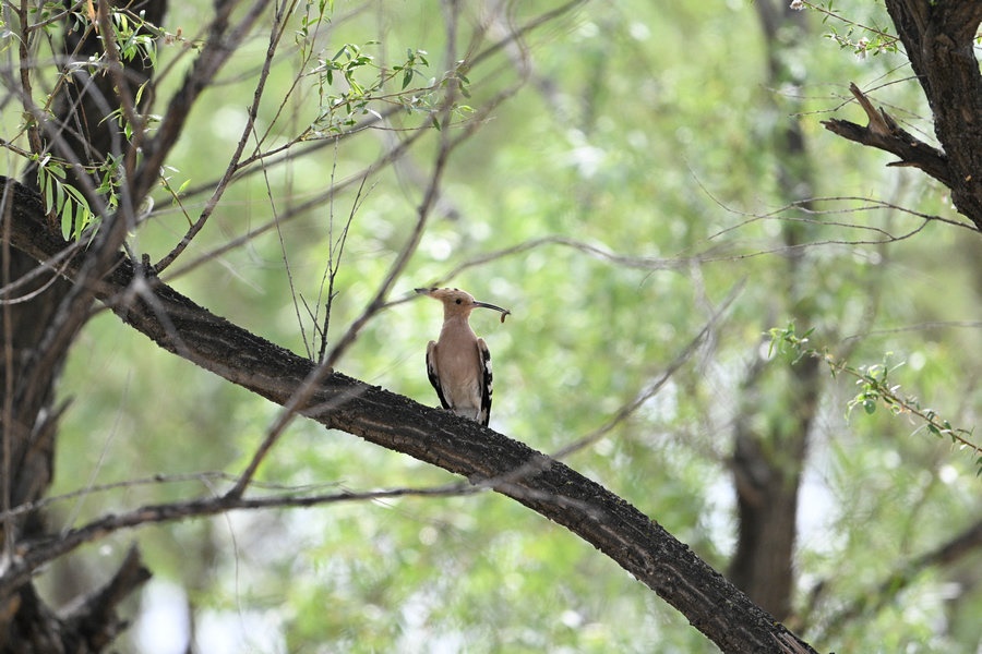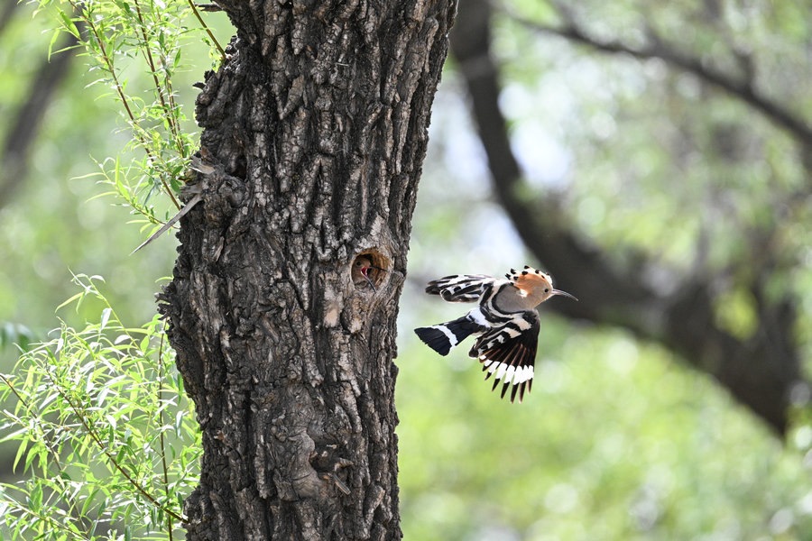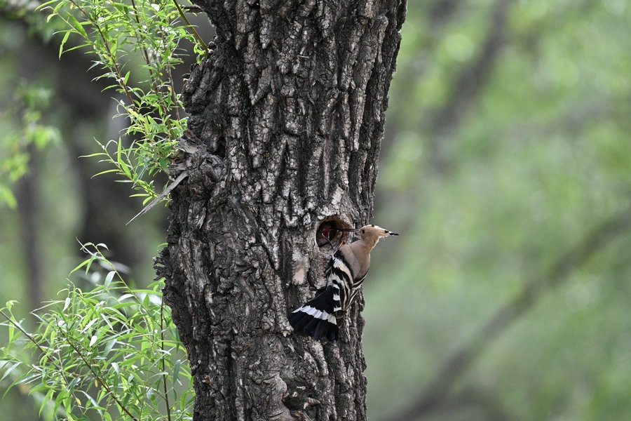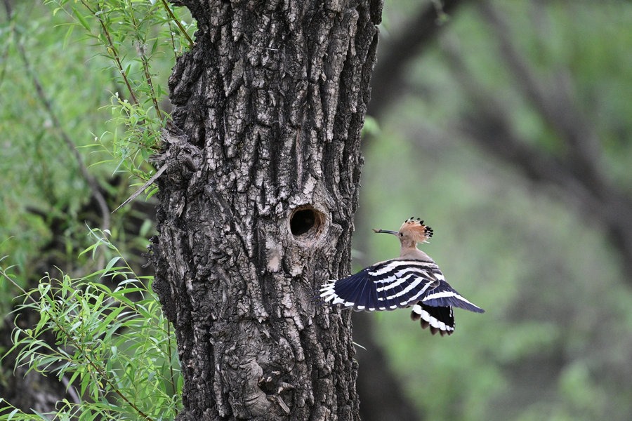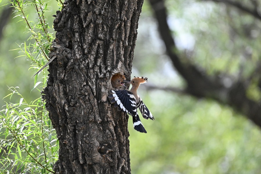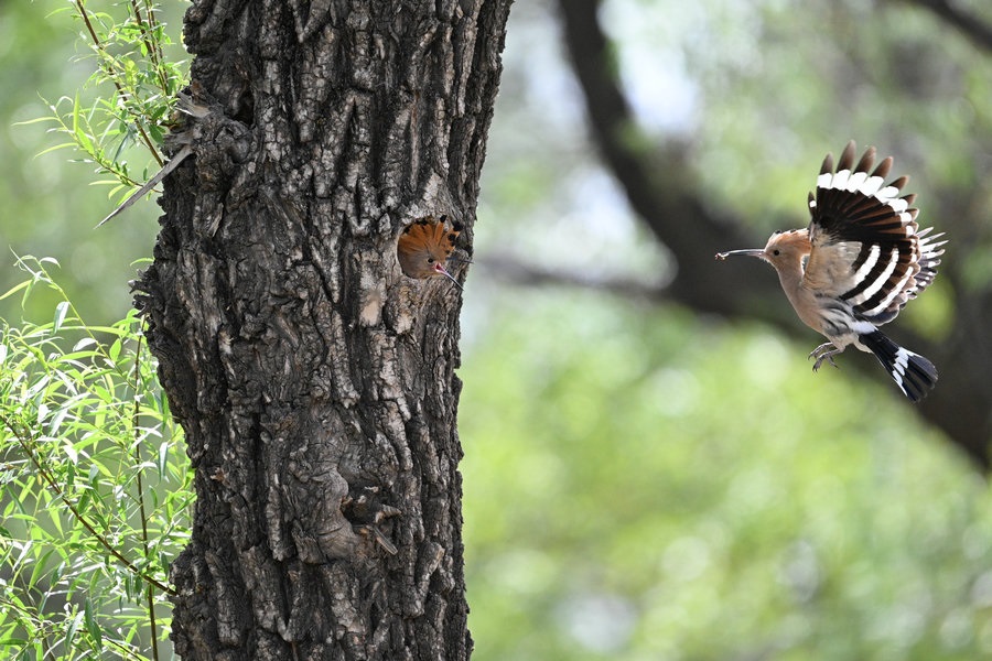 6月4日,呼和浩特市玉泉區(qū)大黑河沿岸,戴勝鳥在樹林、草叢中覓食,捉到蟲子飛回窩喂給鳥寶寶,3個(gè)小時(shí)內(nèi)往返數(shù)十次。吸引了眾多攝影愛好者前來拍攝。