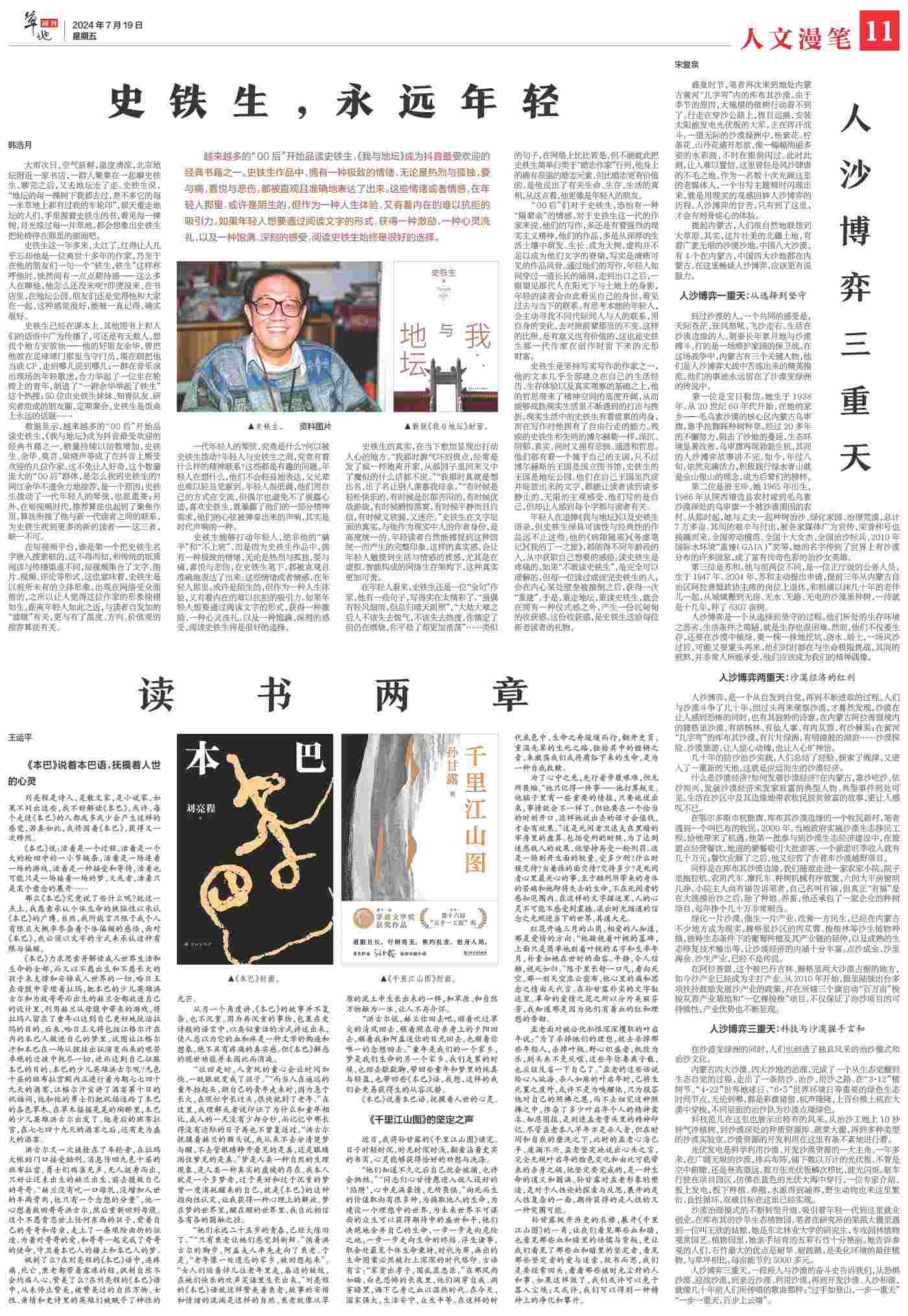 到過沙漠的人,一個共同的感受是,天際蒼茫,狂風(fēng)怒吼,飛沙走石。生活在沙漠邊緣的人,則要長年累月地與沙漠搏斗,打的是一場維護家園的保衛(wèi)戰(zhàn)。在這場戰(zhàn)爭中,內(nèi)蒙古有三個關(guān)鍵人物,他們是人沙博弈大戰(zhàn)中苦練出來的精英模范,他們的事跡永遠(yuǎn)留在了沙漠變綠洲的傳說中。