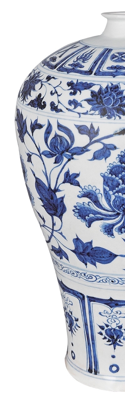 不妨想象:工匠先在坯胎上用青花料繪畫,再施以透明釉,最后在高溫下一次燒成。奇妙的藍色紋樣隨即浮現(xiàn),色澤鮮麗,有金屬光澤。