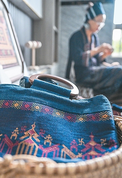 海南省東方市東河鎮(zhèn)黎族傳統(tǒng)紡染織繡技藝省級(jí)傳承人符永英用黎錦制作的手袋。