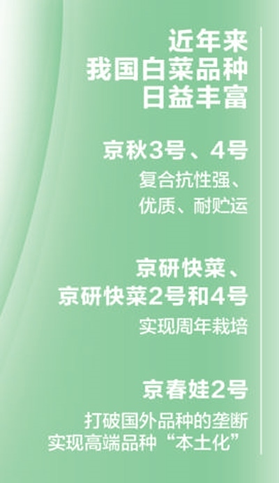 近年來(lái),我國(guó)白菜育種實(shí)力突飛猛進(jìn),品種日益豐富,實(shí)現(xiàn)了從單一“秋播冬貯”向優(yōu)勢(shì)產(chǎn)區(qū)生產(chǎn)、產(chǎn)品多樣化和周年生產(chǎn)轉(zhuǎn)變。培育出了復(fù)合抗性強(qiáng)、優(yōu)質(zhì)、耐貯運(yùn)的品種“京秋3號(hào)、4號(hào)”等,高品質(zhì)、速生苗用品種“京研快菜、京研快菜2號(hào)和4號(hào)”3個(gè)品種搭配實(shí)現(xiàn)了周年栽培,解決了生產(chǎn)上長(zhǎng)期缺乏冬春和夏季栽培專(zhuān)用品種的難題。還育成了娃娃菜、快菜、紹菜、金絲白等高品質(zhì)品種,尤其是“京春娃2號(hào)”一舉打破國(guó)外品種的壟斷,它比國(guó)外品種早熟5至7天,種植密度高25%,畝收入增長(zhǎng)30%,已成為國(guó)產(chǎn)娃娃菜第一大品種,實(shí)現(xiàn)了高端品種的“本土化”。