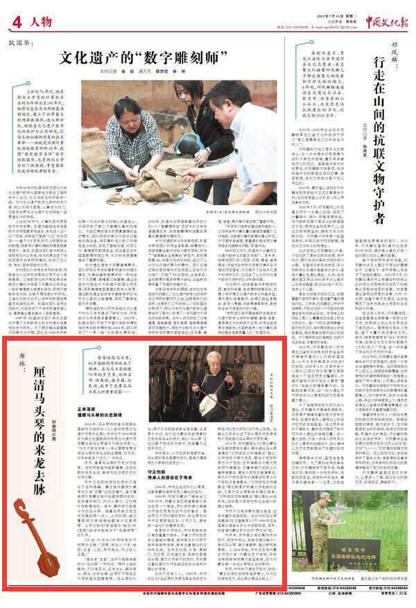 2025年7月14日《中國(guó)文化報(bào)》第4版刊發(fā)了題為《布林:厘清馬頭琴的來(lái)龍去脈》的文章,報(bào)道了做為非物質(zhì)文化遺產(chǎn)項(xiàng)目蒙古族馬頭琴音樂(lè)代表性傳承人的布林立足民間傳說(shuō)的同時(shí)又埋頭于各種典籍。他說(shuō)作為代表性傳承人,有必要更有責(zé)任將馬頭琴的來(lái)龍去脈說(shuō)清楚,對(duì)歷史、對(duì)未來(lái)都有個(gè)交代。