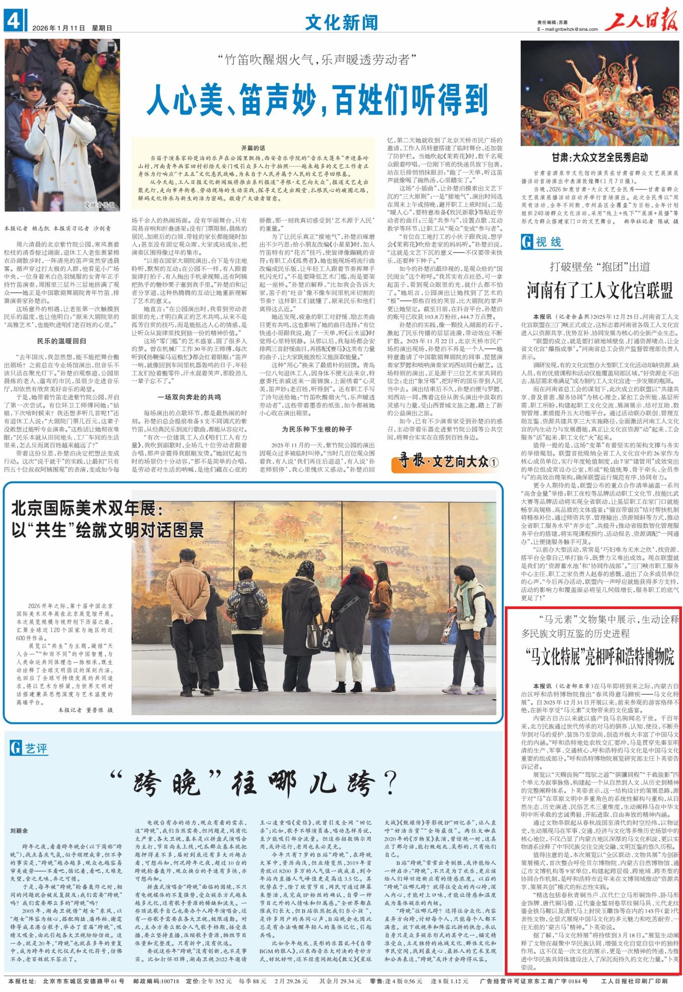 2026年1月11日,《工人日?qǐng)?bào)》第4版刊發(fā)了《“馬文化特展”亮相呼和浩特博物院》的文章,報(bào)道了馬年即將到來之際,呼和浩特博物院于2025年12月31日推出“春風(fēng)得意馬蹄疾——馬文化特展”,吸引眾多游客前來領(lǐng)略馬元素文物的文化魅力,展覽將持續(xù)至3月18日。