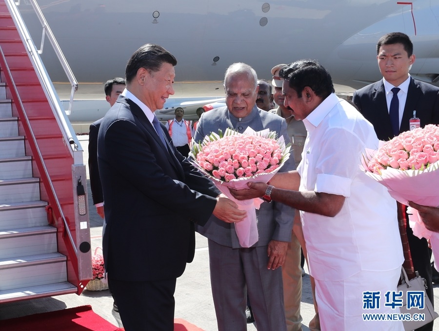 10月11日,國家主席習(xí)近平乘專機抵達金奈,應(yīng)印度共和國總理莫迪邀請,出席中印領(lǐng)導(dǎo)人第二次非正式會晤。印度泰米爾納德邦邦長普羅希特、首席部長帕拉尼斯瓦米等在舷梯旁迎接,向習(xí)近平敬獻鮮花。